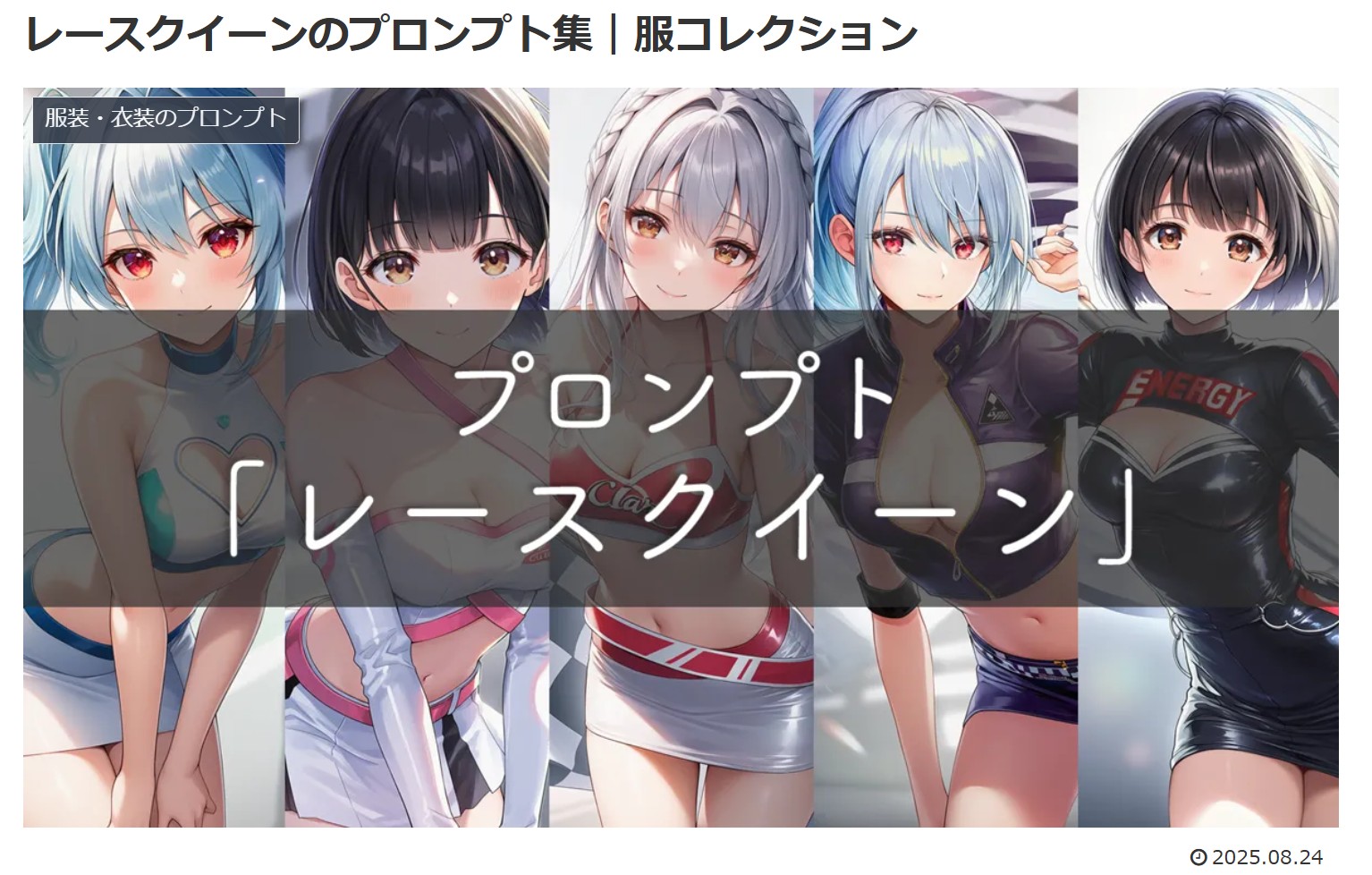 色々な種類のレースクイーンのプロンプトを紹介しているサイト、レースクイーン系の衣装のプロンプトをまとめているサイトのなかでは断トツで1番良かったです。