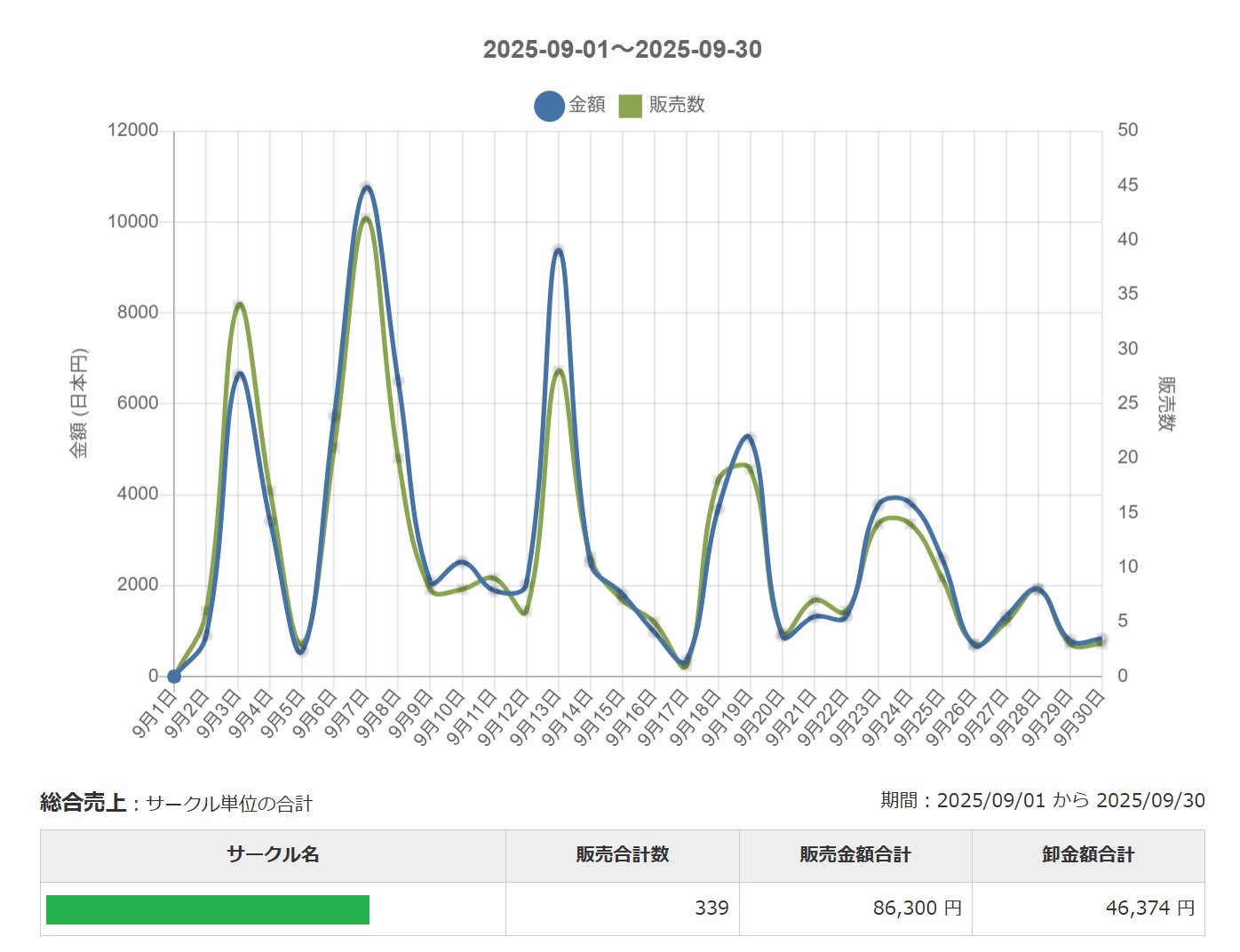 2025年9月はFANZAで9本の新作を追加(合計12作品)して、1か月間の販売本数は339本で売上高は86,300円、利益は46,374円となりました。